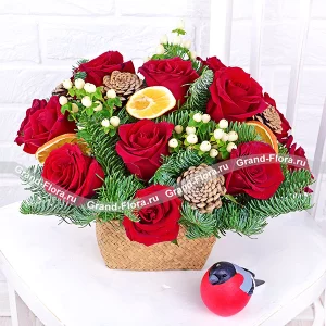 Зимний закат - корзина с красными розами и елью