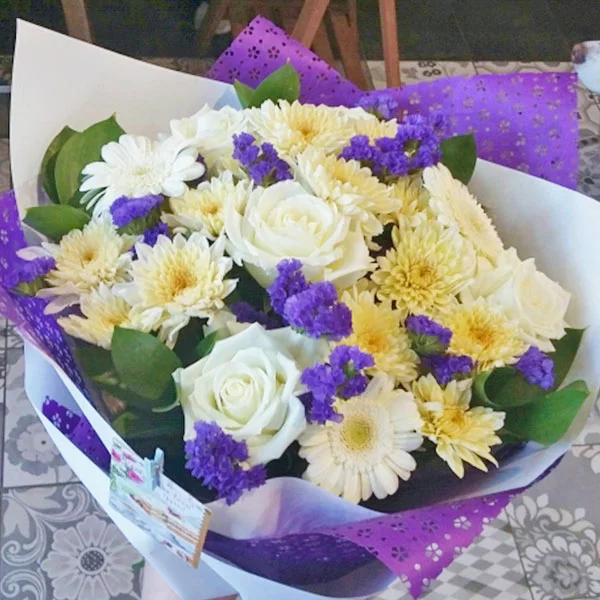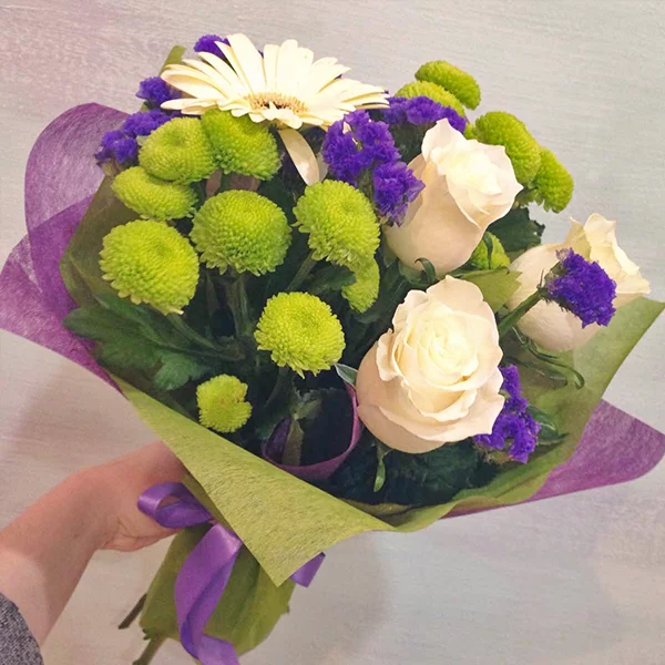 Нежную композицию, составленную из светлых роз и гербер, превосходно подчеркивает кустовая зеленая хризантема. Особое очарование и выразительность придает статица. Яркий фиолетовый букет великолепно подойдет для того, чтобы поздравить коллегу с дня рождения или любым другим торжеством.
