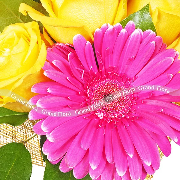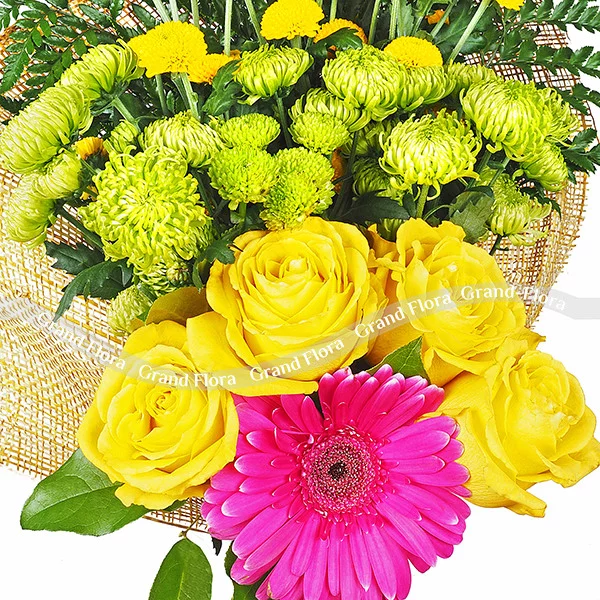 Стандартный (на фото): роза желтая - 4 шт., гербера малиновая - 1 шт., хризантема кустовая зеленая - 2 шт., хризантема кустовая желтая - 2 шт., папаратник - 4 шт., упаковка натуральная.