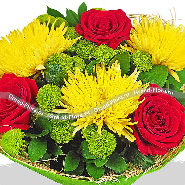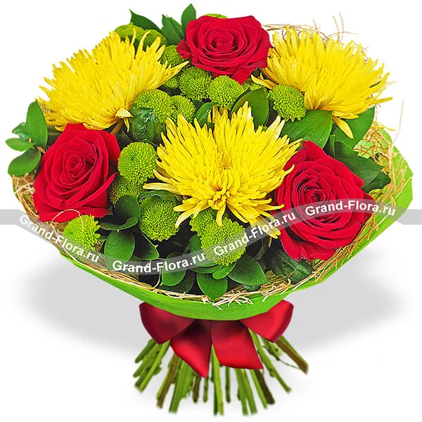 ДЕЛЮКС: роза красная - 8 шт, хризантема одноголовая желтая - 7 шт, хризантема кустовая зеленая - 6 шт, рускус, фетр зеленый.