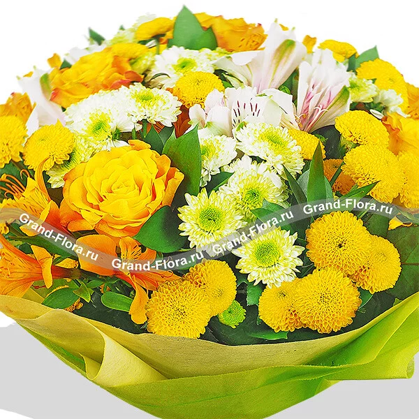Стандартный (на фото): роза желтая/оранжевая - 5 шт, хризантема кустовая желтая - 3 шт, альстромерия желтая - 2 шт, альстромерия белая - 1 шт, хризантема кустовая белая - 3 шт, рускус, фетр зеленый.