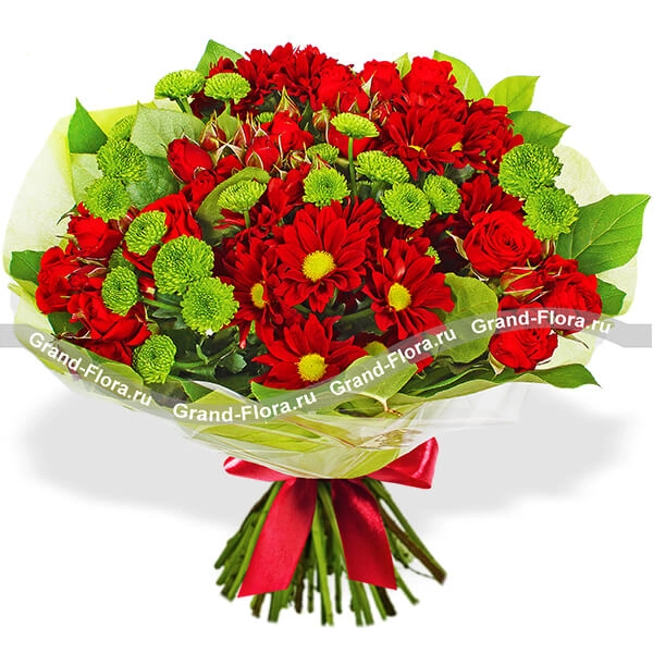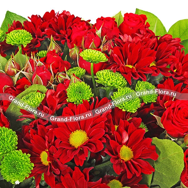 ЛЮКС: хризантема кустовая красная - 5 шт., хризантема зеленая кустовая - 5 шт., роза красная кустовая - 6шт., салал, фетр зеленый.