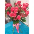 ЛЮКС: роза кустовая розовая - 15 шт, декоративная зелень, упаковка, лента розовая. Примерный размер: 35Х35 см.