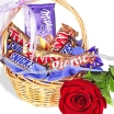 ЛЮКС: роза красная (70 см) - 1 шт., Twix - 4 шт., Snikers (маленький) - 4 шт., Picnic - 2 шт., шоколад "Milka" - 2 шт., декоративная зелень, корзина малая, фетр фиолетовый, бант сиреневый.