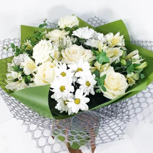 Букет красивый! Очень много зелени и розы - смотрится просто и классно. Свежайшие цветы, оригинально и интересно собрано все, я довольна очень! Спасибо!