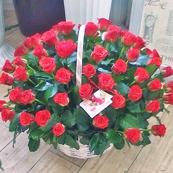 Выбрали 51 розу. Заказали доставку по случаю юбилея нашего руководителя и очень рады что выбрали именно эту компанию! Все соответствует фото на сайте: светлая корзина и отменные, крупные красные розы.