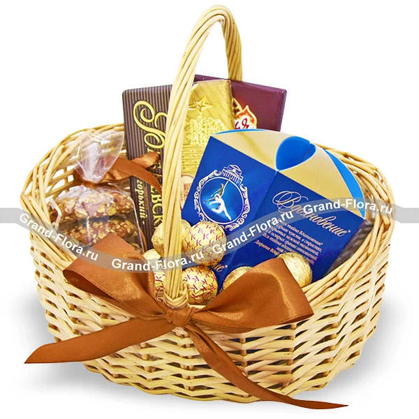 Стандартный: конфеты "Вдохновение" - 150г., шоколад "Россия" - 1 шт., шоколад "Бабаевский" - 1 шт., конфеты "Коркунов" - 135 гр., печенье, декор, корзина.