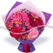 Уменьшенный: роза красная - 1 шт., роза кустовая красная - 2 шт., роза кустовая розовая - 2 шт., хризантема кустовая ромашковая розовая - 2 шт., декор, упаковка, лента. Примерный размер: 20Х20 см.
