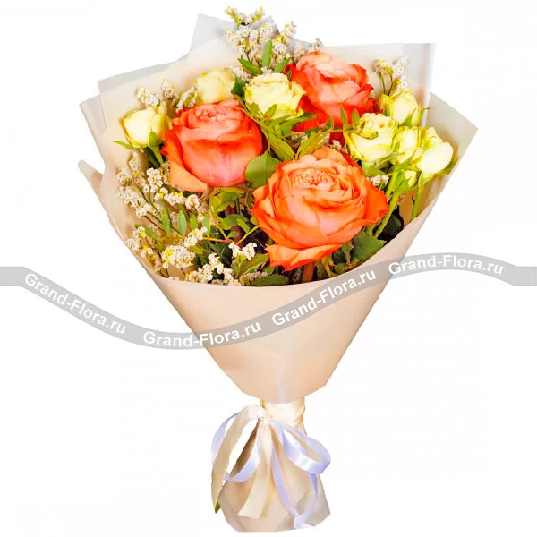 Хотите подарить яркие эиоции тому, кто дорог? Закажите букет "Апельсиновый джем" с доставкой на дом или в офис! Получателя приятно удивит сочетание оттенов! В этом букете оранжевые одноголовые розы гармонично сочетаются с  кремоввми кустовыми, а нежная гипсофила придает воздушность и легкость композиции. Букет станет приятным комплиментом, знаком внимания и безусловно, наполнит день получателя радостью!
